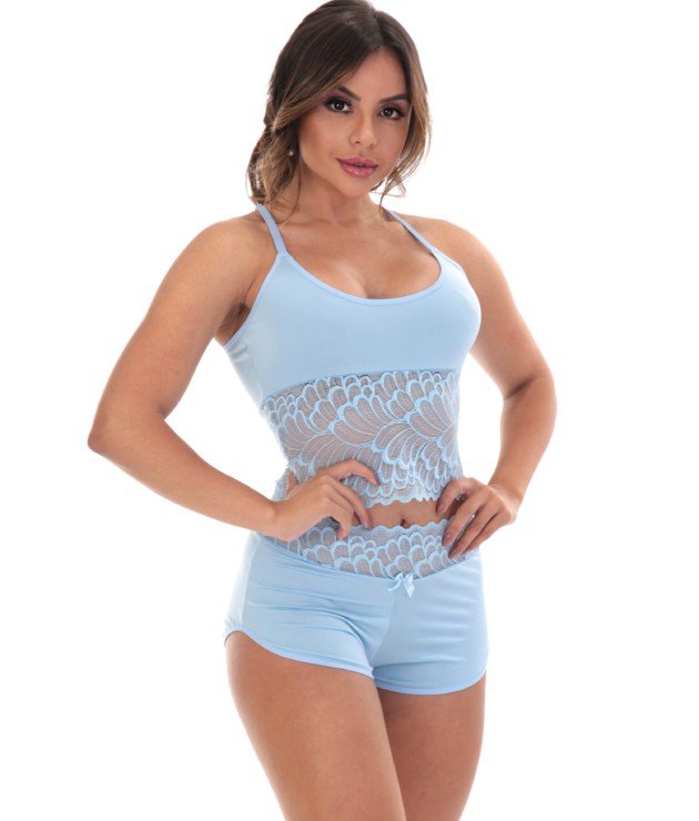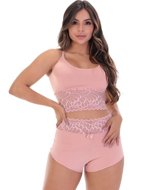 Os detalhes em renda são o grande charme da peça, trazendo um toque sofisticado e sensual. A renda está presente na blusa e na pala do short, criando um visual harmonioso e delicado. O desenho da renda pode variar, tornando cada peça ainda mais especial.